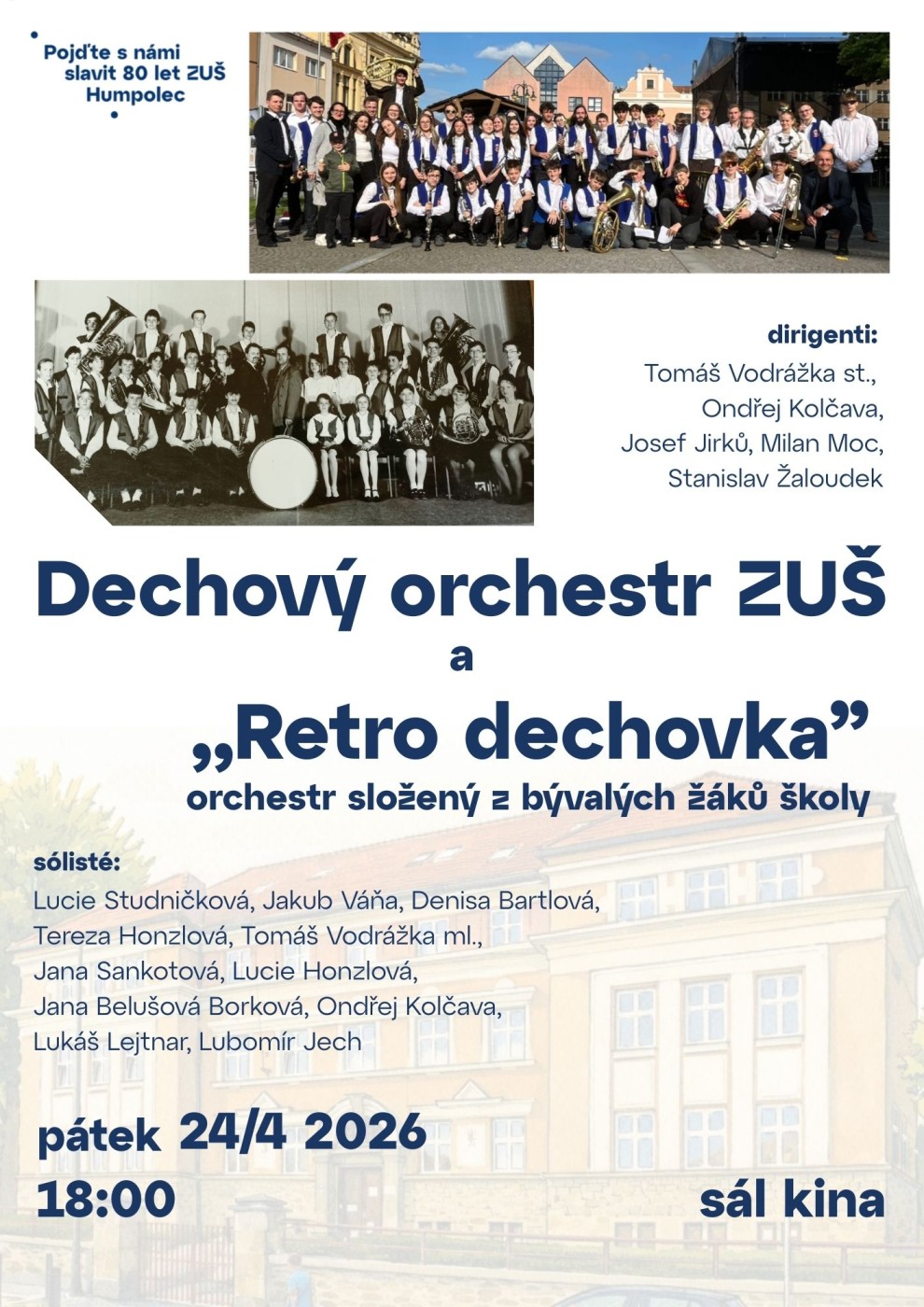 Dechový orchestr ZUŠ a "Retro" dechovka24. 4. od 18:00 v sále kina uslyšíte dva orchestry ze současných a z bývalých žáků školy. Dirigují Josef Jirků, Milan Moc, Stanislav Žaloudek, Ondřej Kolčava a Tomáš Vodrážka st.