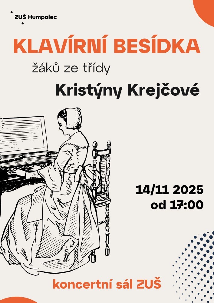 Klavírní besídka Kristýny Krejčové14. 11. od 17:00 v koncertním sále školy se vám představí žáci ze třídy Kristýny Krejčové