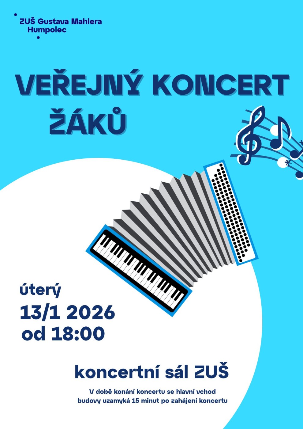 Veřejný koncert žáků13. 1. od 18:00 v koncertním sále školyV době konání koncertu se hlavní vchod budovy uzamyká 15 minut po zahájení koncertu.