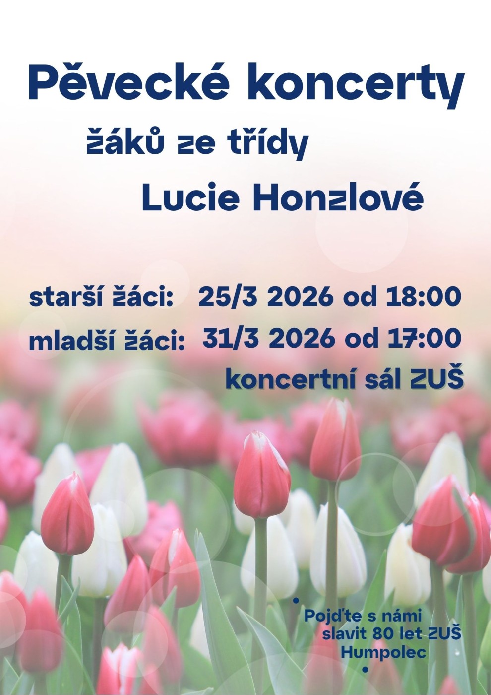 Pěvecké koncerty žáků Lucie Honzlovéstarší žáci 25. 3. od 18:00 a mladší žáci 31. 3. od 17:00 v koncertním sále školy