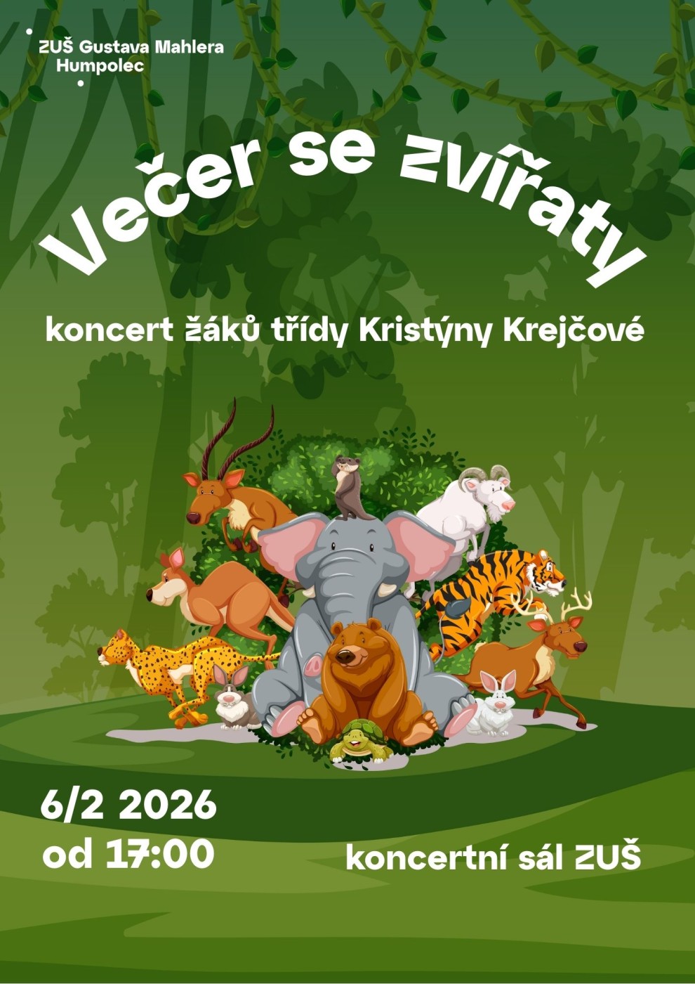 Večer se zvířaty6. 2. od 17:00 se na vás těší žáci ze třídy Kristýny Krejčové. Přijďte do koncertního sálu školy.