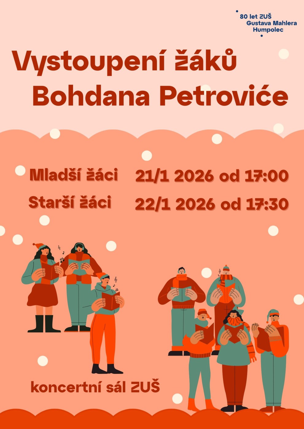 Vystoupení žáků Bohdana PetrovićeTěší se na vás mladší žáci 21. 1. od 17:00 a starší žáci 22. 1. od 17:30 v koncertním sále školy.